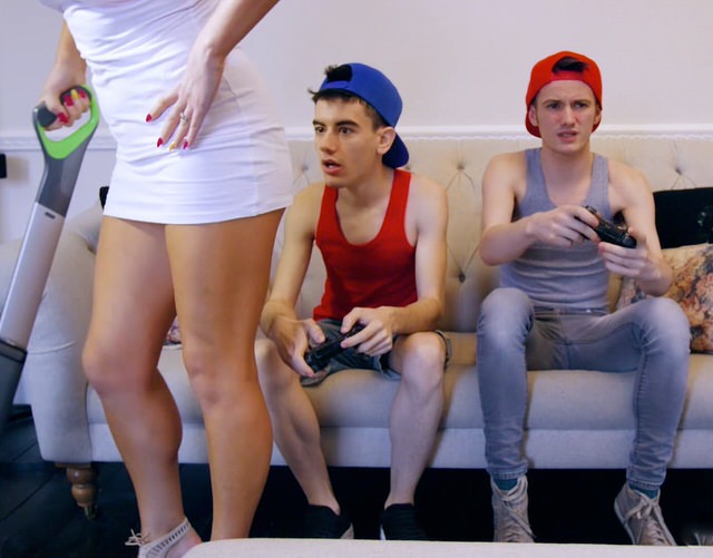 Сэм позвал своего приятеля к себе домой, чтобы тот составил ему компанию во время игры в XBOX. Вот только гостю игрушки быстро разонравились, когда он увидел вертящуюся неподалеку фигуристую блондинку – мамашу его друга. Похотливая милфа сама подавала недвусмысленные сигналы подростку, выпячивая перед ним свои прелести. А когда тот проследовал за ней на кухню, зрелая шалава приподняла халатик и попросила себя хорошенько отшлепать. Вскоре парочка уже вовсю занималась сексом, пробуя самые разнообразные позы.