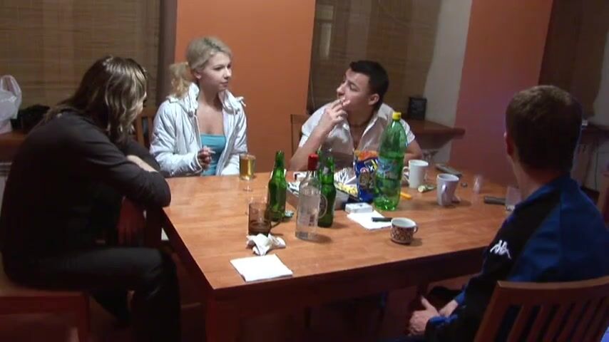 Описание: Группка предприимчивых парней пригласила на свою пьянку подругу одного из них. Молодые люди быстро положили глаз на симпатичную блондиночку и стали воплощать в реальность план по ее спаиванию. Девочке предложили пари – четыре стакана крепкого алкоголя и четыре долларовых бумажки. Та оказалась очень падкой на легкие деньги и с удовольствием согласилась, умяв все порции одну за одной. Теперь всей компании осталось только раздеть неспособную сопротивляться гостью и пустить по кругу, запихивая члены во все отверстия.