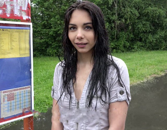 Стройная черноволосая симпатяжка торопилась на свидание к своему парню, но нужный ей автобус так и не пришел. Так бы и стояла она еще пару часов вся мокрая, если бы не проходящий мимо парень с камерой. Мило побеседовав с девушкой и посочувствовав ее проблеме, он предложил выход из ситуации. Уделив двадцать минут ему и его большому половому органу, промокшая и порядком уставшая брюнетка получит крупную сумму, которой не только хватит на такси до дома ее парня, но и на другие расходы. Само собой, от какого предложения девочка не отказалась и получила полный рот спермы.