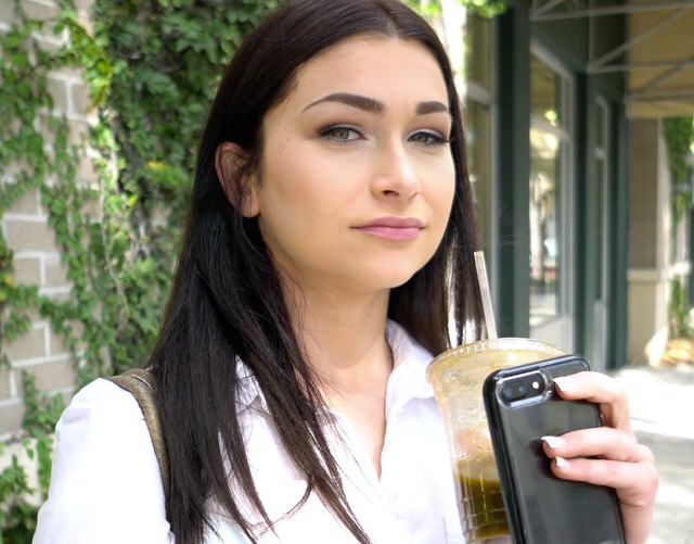 Гламурная телочка шла себе по улице и попивала сок из стаканчика, но в ее личное пространство внезапно вторгся молодой человек с камерой. Парень оказался довольно любознательным и захотел узнать, что скрывается под короткой юбкой девушки. Та, конечно, сначала недоумевала и даже пыталась сыграть возмущение, хотя на самом деле только и ждала, когда уже ее новый знакомый достанет из кармана пачку купюр и заплатит. Разбогатев на несколько сотен долларов, шлюшка сразу стала податливее и позволила делать с собой всякие непристойности.