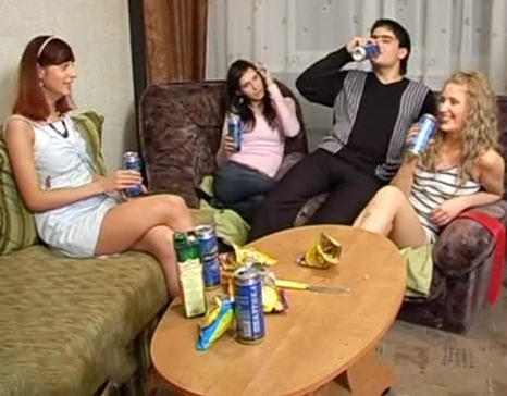 Российская молодежь закатила небольшую вечеринку на хате одного из них. Как и водится, девочки и алкоголь были в избытке. Пока вся компания опрокидывала рюмку за рюмкой, особо активная рыжая сучка повела своего приятеля трахаться в свободную комнату. У остальных троих парней дела с их барышняме не заладились – те оказались на редкость стеснительными и давать не торопились. Тогда пацаны просто забили болт и отправились на подмогу своему товарищу. Рыжая оказалась той еще нимфоманкой, поэтому с удовольствием обслужила всех.